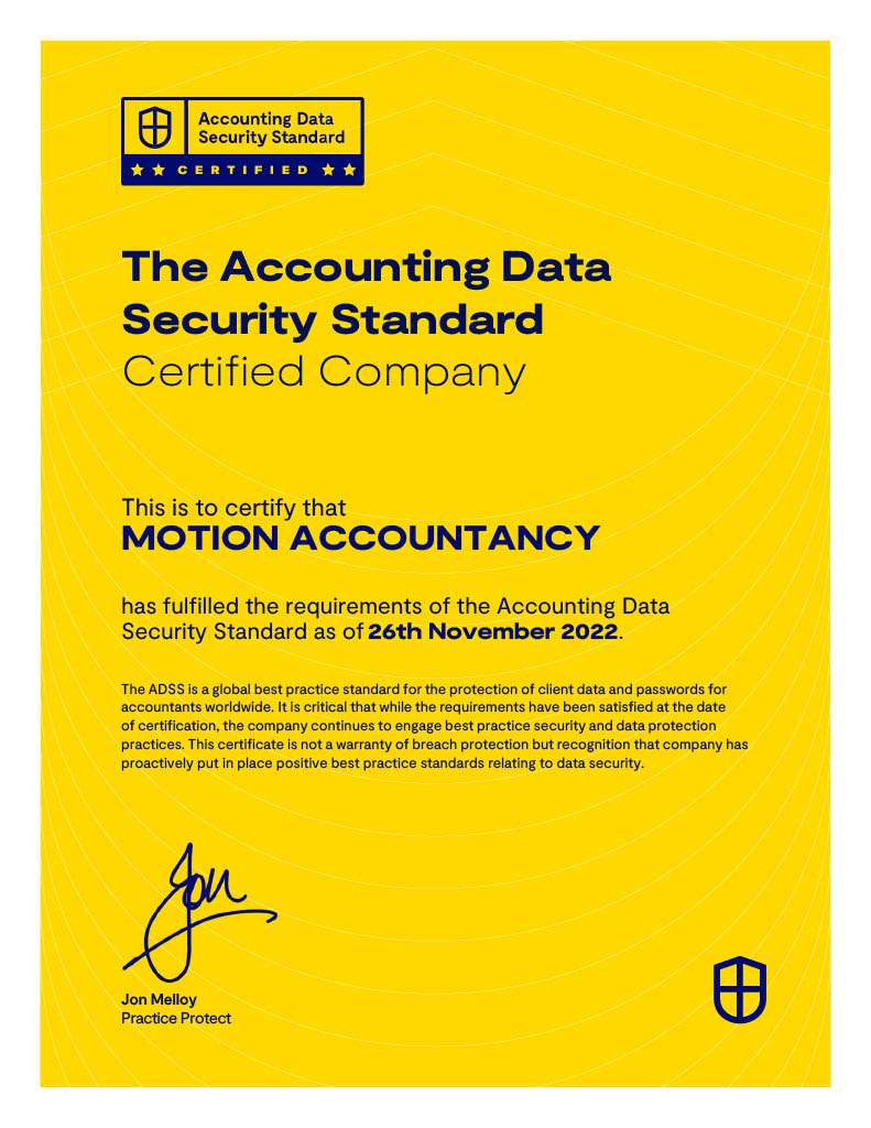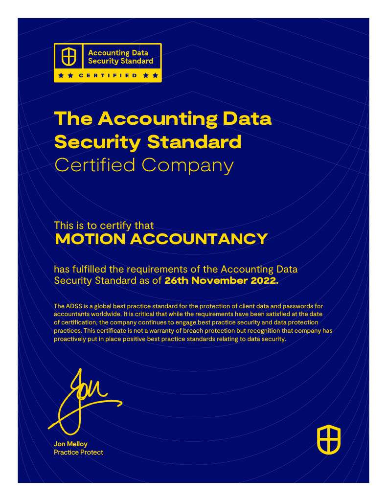 Motion Accountancy is an Accounting Data Security Standard certified company. The ADSS is the gold standard in data safety and security.